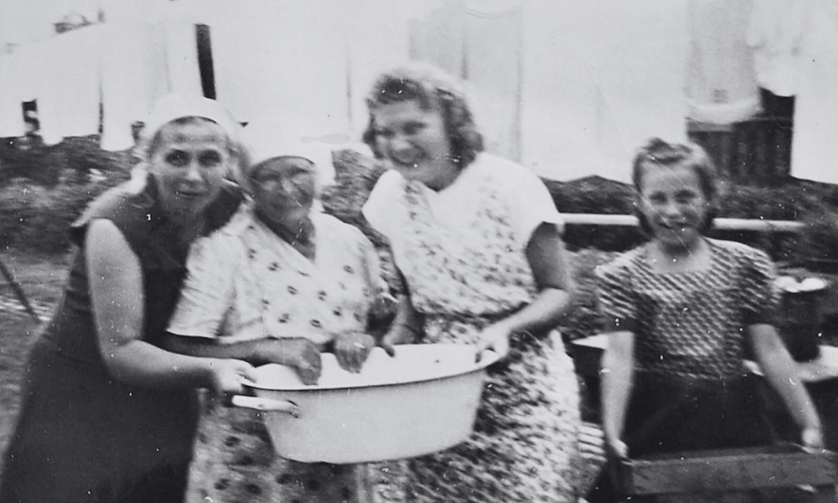 This immigrant family, my family, is enjoying an afternoon washing laundry and canning tomatoes in their backyard.